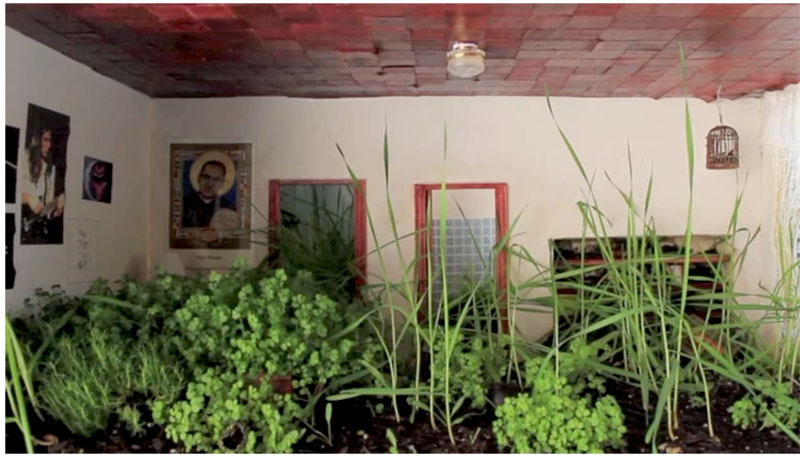 Childhood Bedroom is a reconstruction from memory of the artist's childhood home, a place that no longer exists as she remembers it, a place that she abandoned in a haste. The model was made with foam board, wood, cloth, glue, paper, gesso, and digital photographs that recreated her childhood posters placed on the wall. The model was filled with soil, baby tears, and wheat grass seeds, and was watered and filmed on a daily basis for a period of three months until the pristine place of memory was transformed by the lush garden into a different representation of life. The video speaks about the ways in which memory is able to reconstruct a space. However, it also explores the process of forgetting as the space was abandoned and destroyed. |