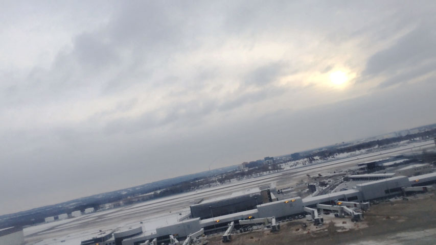 MSP to RAP shows the trip from Minneapolis/St Paul airport to Rapid City airport. Taken from a passenger’s point of view, the video shows both take off and landing with little footage in-between. As the loop continues from take off to landing, the irony emerges when seen through a static window. |
