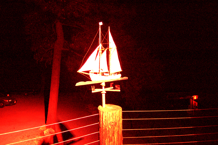 A tall ship weather vane, firmly anchored to a post, is thrust into a ‘dry seas Journey’ of light, color, sound and shadow.