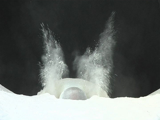 A face on a bed of flour starts to dig itself into the pile. By repeatedly blowing the flour is moved to the side and goes up like a fountain. The flour covers the head and the back and turns into an abstract entity. The flour as a cultural asset and the existential process of breathing combine to create a homogeneous cyclic proces. |
